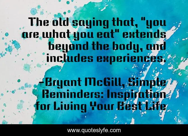 This page presents the quote "The old saying that, "you are what you eat" extends beyond the body, and includes experiences.". Author of this quote is Bryant McGill, Simple Reminders: Inspiration for Living Your Best Life. This quote is about spirituality, experiences, teaching,.