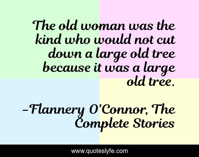 This page presents the quote "The old woman was the kind who would not cut down a large old tree because it was a large old tree.". Author of this quote is Flannery O'Connor, The Complete Stories. This quote is about parkers-back, funny, comedy,.