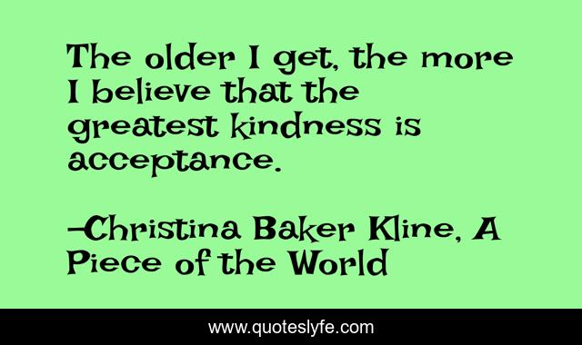 This page presents the quote "The older I get, the more I believe that the greatest kindness is acceptance.". Author of this quote is Christina Baker Kline, A Piece of the World. This quote is about compassion, acceptance-of-oneself, acceptance, acceptance-of-others,.
