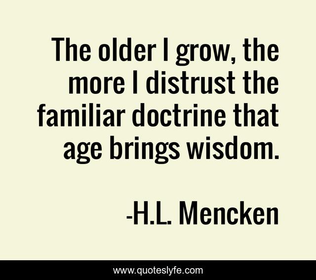 This page presents the quote "The older I grow, the more I distrust the familiar doctrine that age brings wisdom.". Author of this quote is H.L. Mencken. This quote is about humor, age, old, wisdom,.