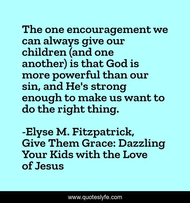 This page presents the quote "The one encouragement we can always give our children (and one another) is that God is more powerful than our sin, and He's strong enough to make us want to do the right thing.". Author of this quote is Elyse M. Fitzpatrick, Give Them Grace: Dazzling Your Kids with the Love of Jesus. This quote is about parenting, children,.