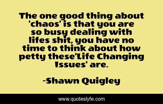 This page presents the quote "The one good thing about 'chaos' is that you are so busy dealing with lifes shit, you have no time to think about how petty these'Life Changing Issues' are.". Author of this quote is Shawn Quigley. .