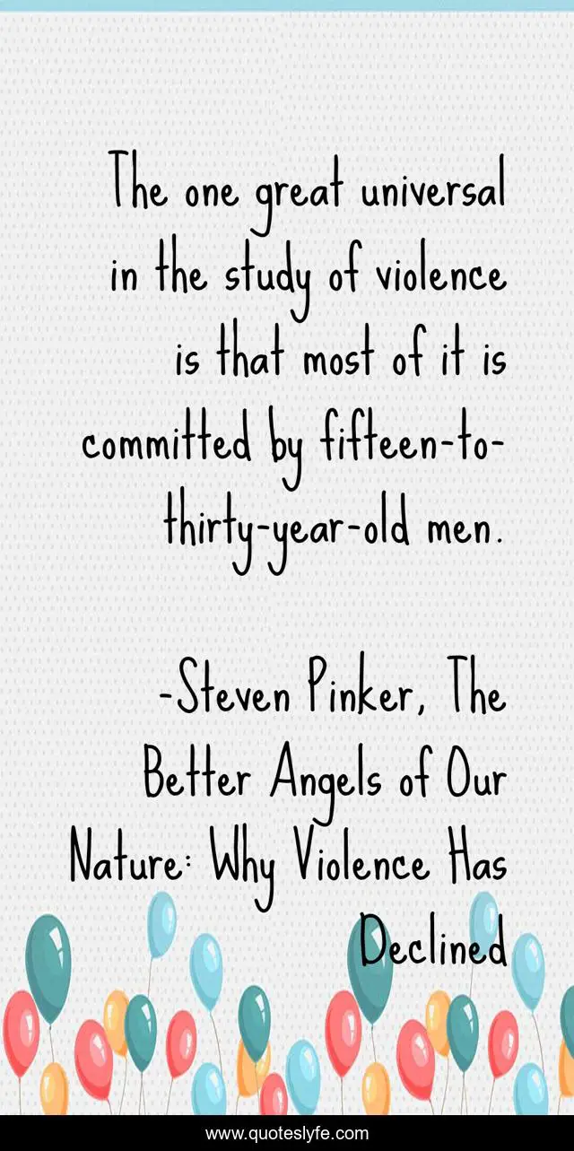 This page presents the quote "The one great universal in the study of violence is that most of it is committed by fifteen-to-thirty-year-old men.". Author of this quote is Steven Pinker, The Better Angels of Our Nature: Why Violence Has Declined. This quote is about universal, men, truth, violence,.