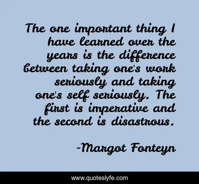 This page presents the quote "The one important thing I have learned over the years is the difference between taking one's work seriously and taking one's self seriously. The first is imperative and the second is disastrous.". Author of this quote is Margot Fonteyn. .