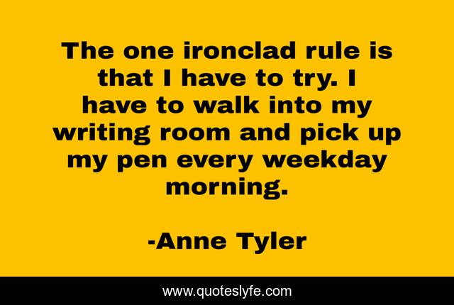 This page presents the quote "The one ironclad rule is that I have to try. I have to walk into my writing room and pick up my pen every weekday morning.". Author of this quote is Anne Tyler. This quote is about enthusiasm, author, inspirational, writing,.