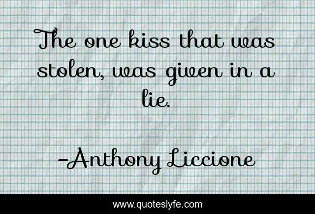 This page presents the quote "The one kiss that was stolen, was given in a lie.". Author of this quote is Anthony Liccione. This quote is about lie, force, violate, cheat, decieve, take, kiss, tempt, steal,.