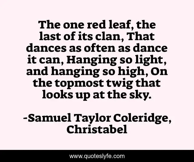 This page presents the quote "The one red leaf, the last of its clan, That dances as often as dance it can, Hanging so light, and hanging so high, On the topmost twig that looks up at the sky.". Author of this quote is Samuel Taylor Coleridge, Christabel. This quote is about autumn, fall, poetry, nature,.