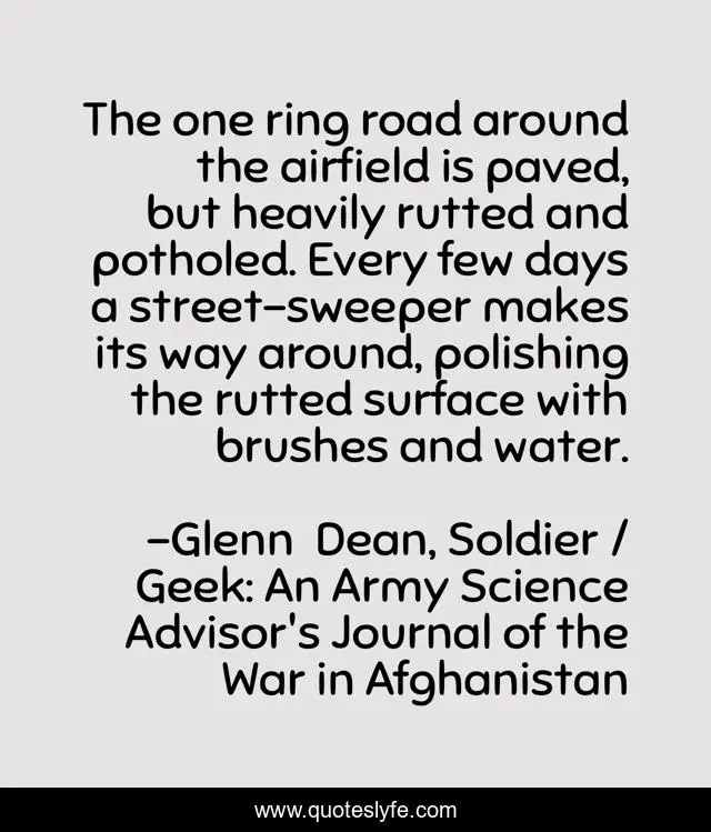 This page presents the quote "The one ring road around the airfield is paved, but heavily rutted and potholed. Every few days a street-sweeper makes its way around, polishing the rutted surface with brushes and water.". Author of this quote is Glenn Dean, Soldier / Geek: An Army Science Advisor's Journal of the War in Afghanistan. This quote is about afghanistan, military,.