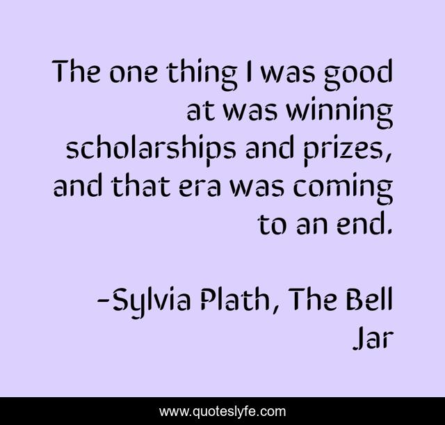 This page presents the quote "The one thing I was good at was winning scholarships and prizes, and that era was coming to an end.". Author of this quote is Sylvia Plath, The Bell Jar. This quote is about fear-of-failure, inadequacy, growing-up, depression, school,.