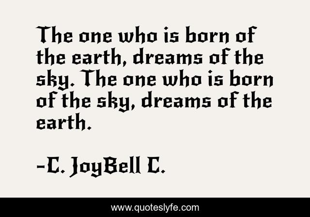 This page presents the quote "The one who is born of the earth, dreams of the sky. The one who is born of the sky, dreams of the earth.". Author of this quote is C. JoyBell C.. This quote is about being-humble, inspirational-attitude, inspirational, humility, inspirational-life, enthusiasm,.