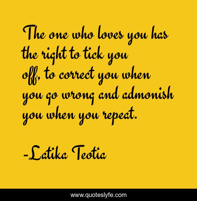 This page presents the quote "The one who loves you has the right to tick you off, to correct you when you go wrong and admonish you when you repeat.". Author of this quote is Latika Teotia. This quote is about life, right, love, self, your-life, affection,.