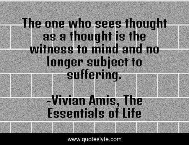 This page presents the quote "The one who sees thought as a thought is the witness to mind and no longer subject to suffering.". Author of this quote is Vivian Amis, The Essentials of Life. This quote is about sadness, emotions, suffering, witness, depression, healing,.