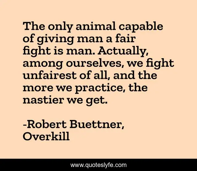 This page presents the quote "The only animal capable of giving man a fair fight is man. Actually, among ourselves, we fight unfairest of all, and the more we practice, the nastier we get.". Author of this quote is Robert Buettner, Overkill. This quote is about brutality, human-nature, human-superiority, fighting, humanity, unfairness, war,.