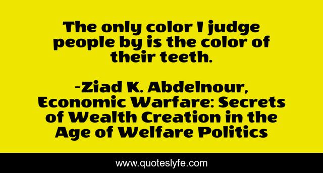 This page presents the quote "The only color I judge people by is the color of their teeth.". Author of this quote is Ziad K. Abdelnour, Economic Warfare: Secrets of Wealth Creation in the Age of Welfare Politics. This quote is about color, judgement,.