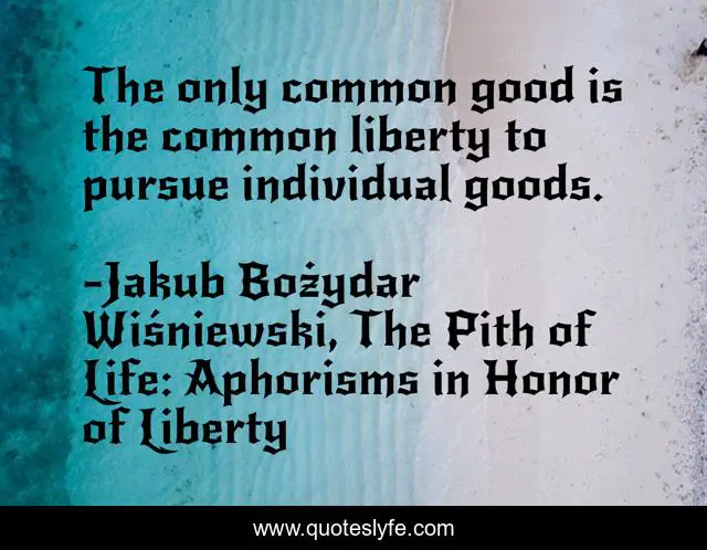This page presents the quote "The only common good is the common liberty to pursue individual goods.". Author of this quote is Jakub Bożydar Wiśniewski, The Pith of Life: Aphorisms in Honor of Liberty. This quote is about common-good, collectivism, liberty, individualism,.