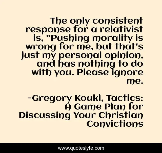 This page presents the quote "The only consistent response for a relativist is, "Pushing morality is wrong for me, but that's just my personal opinion, and has nothing to do with you. Please ignore me.". Author of this quote is Gregory Koukl, Tactics: A Game Plan for Discussing Your Christian Convictions. This quote is about relativism, christianity, morality,.