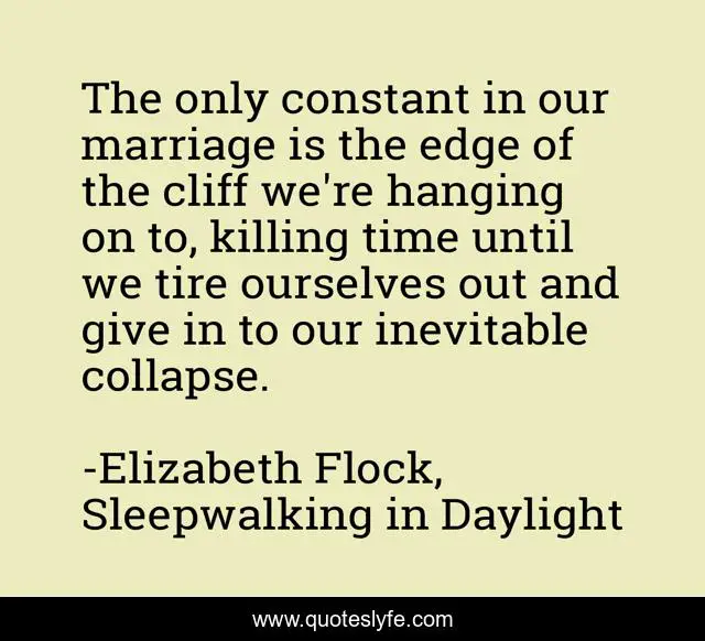 This page presents the quote "The only constant in our marriage is the edge of the cliff we're hanging on to, killing time until we tire ourselves out and give in to our inevitable collapse.". Author of this quote is Elizabeth Flock, Sleepwalking in Daylight. This quote is about seperation, marriage, inevitable, sad,.
