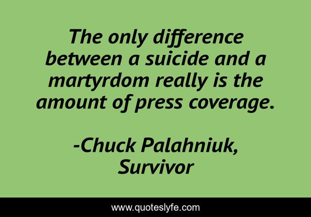 This page presents the quote "The only difference between a suicide and a martyrdom really is the amount of press coverage.". Author of this quote is Chuck Palahniuk, Survivor. This quote is about suicide, martyrdom,.