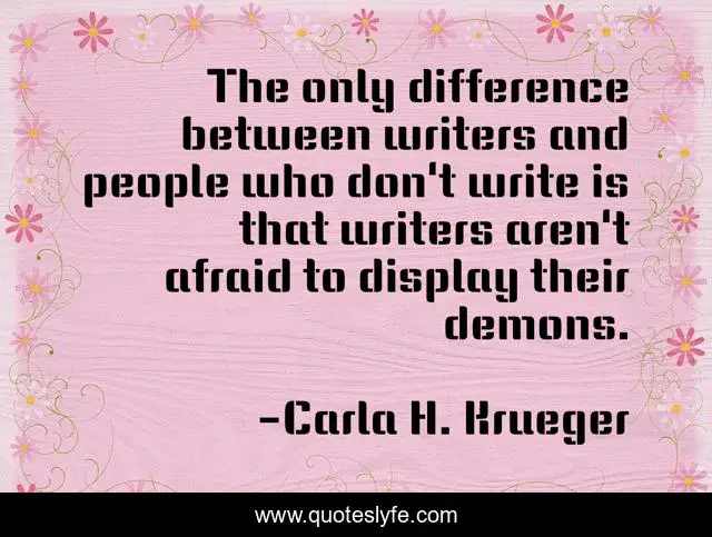 This page presents the quote "The only difference between writers and people who don't write is that writers aren't afraid to display their demons.". Author of this quote is Carla H. Krueger. This quote is about writing-life, writing-books, honesty, writing-advice, writing-process, demons, writing-tips, writers, writers-on-writing,.