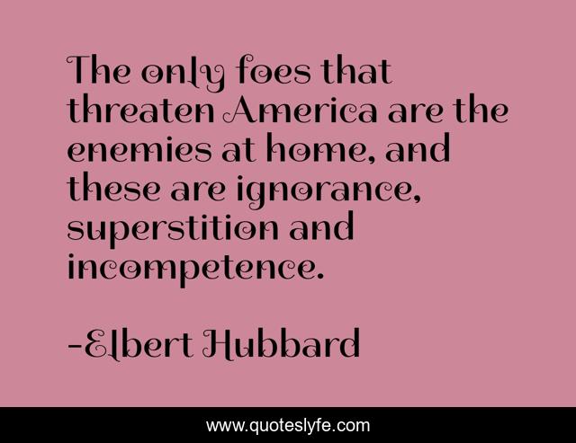 This page presents the quote "The only foes that threaten America are the enemies at home, and these are ignorance, superstition and incompetence.". Author of this quote is Elbert Hubbard. This quote is about america, ignorance,.