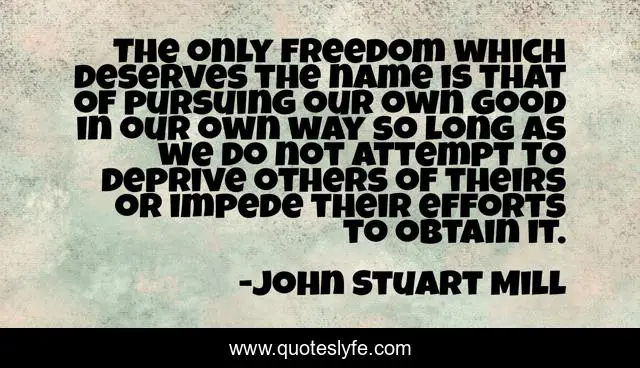 This page presents the quote "The only freedom which deserves the name is that of pursuing our own good in our own way so long as we do not attempt to deprive others of theirs or impede their efforts to obtain it.". Author of this quote is John Stuart Mill. .