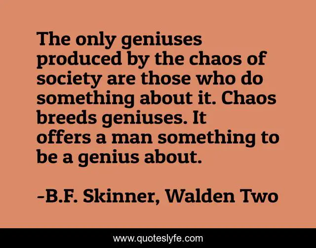 This page presents the quote "The only geniuses produced by the chaos of society are those who do something about it. Chaos breeds geniuses. It offers a man something to be a genius about.". Author of this quote is B.F. Skinner, Walden Two. This quote is about genius, chaos, society,.