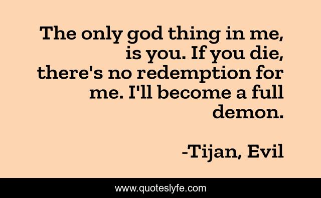 This page presents the quote "The only god thing in me, is you. If you die, there's no redemption for me. I'll become a full demon.". Author of this quote is Tijan, Evil. This quote is about new-adult, kellan-and-shay, kellan, quote, shay, evil, romance, new-adult-paranormal-romance, tijan,.
