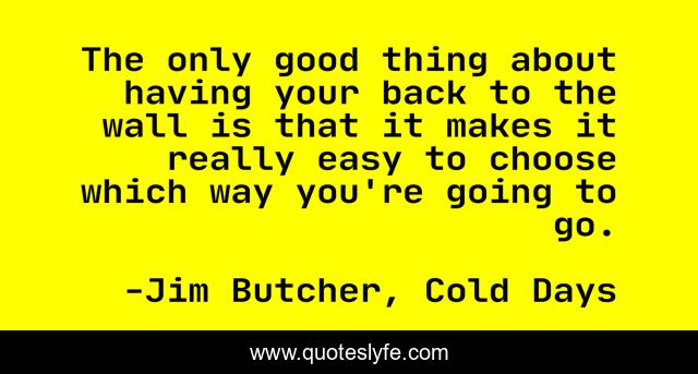 This page presents the quote "The only good thing about having your back to the wall is that it makes it really easy to choose which way you're going to go.". Author of this quote is Jim Butcher, Cold Days. This quote is about back-to-the-wall, decisions,.