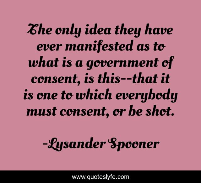 This page presents the quote "The only idea they have ever manifested as to what is a government of consent, is this--that it is one to which everybody must consent, or be shot.". Author of this quote is Lysander Spooner. This quote is about anarchy, force, brutality, government, freedom, violence, statism, liberty, free-society,.