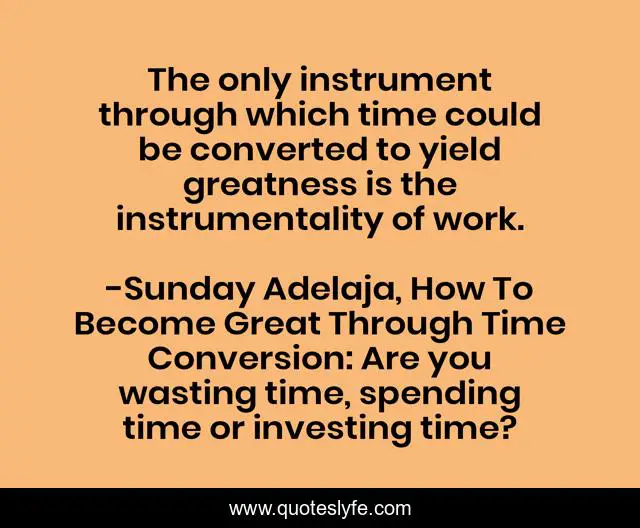This page presents the quote "The only instrument through which time could be converted to yield greatness is the instrumentality of work.". Author of this quote is Sunday Adelaja, How To Become Great Through Time Conversion: Are you wasting time, spending time or investing time?. This quote is about life, conversion, productivity, wealth, instrument, greatness, waste, humanity, product,.