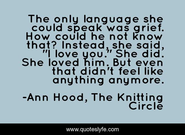 This page presents the quote "The only language she could speak was grief. How could he not know that? Instead, she said, "I love you." She did. She loved him. But even that didn't feel like anything anymore.". Author of this quote is Ann Hood, The Knitting Circle. .