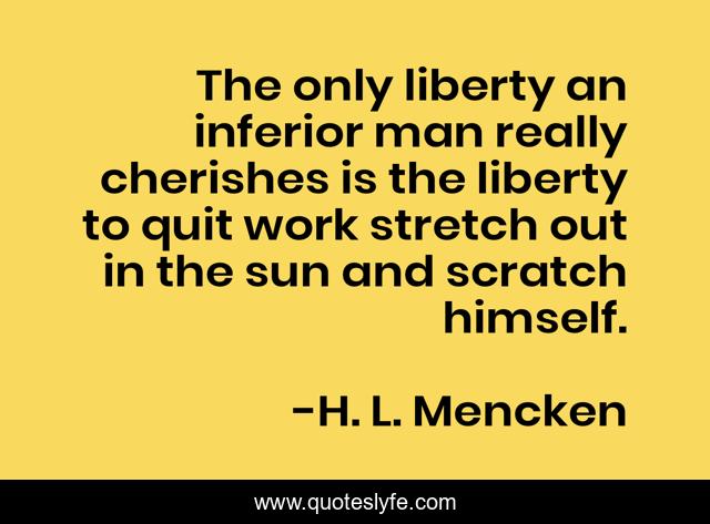 This page presents the quote "The only liberty an inferior man really cherishes is the liberty to quit work stretch out in the sun and scratch himself.". Author of this quote is H. L. Mencken. This quote is about retirement, leisure,.