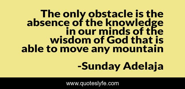This page presents the quote "The only obstacle is the absence of the knowledge in our minds of the wisdom of God that is able to move any mountain". Author of this quote is Sunday Adelaja. This quote is about mountain, reality-of-life, knowledge, prosperity, god, move, able, absence, minds,.