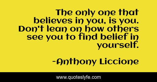 This page presents the quote "The only one that believes in you, is you. Don't lean on how others see you to find belief in yourself.". Author of this quote is Anthony Liccione. This quote is about confidence, inner-searching, believing-in-yourself, self-esteem,.