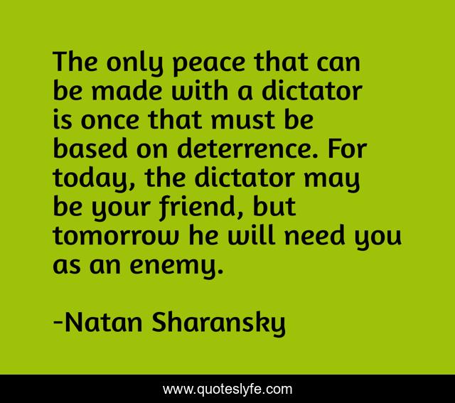 This page presents the quote "The only peace that can be made with a dictator is once that must be based on deterrence. For today, the dictator may be your friend, but tomorrow he will need you as an enemy.". Author of this quote is Natan Sharansky. This quote is about today, tomorrow, friend,.