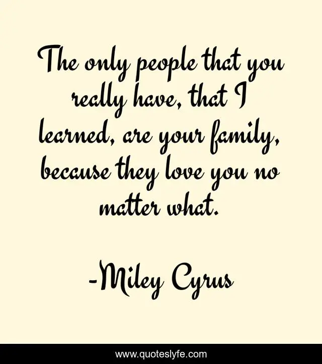 This page presents the quote "The only people that you really have, that I learned, are your family, because they love you no matter what.". Author of this quote is Miley Cyrus. This quote is about love, affection, people,.