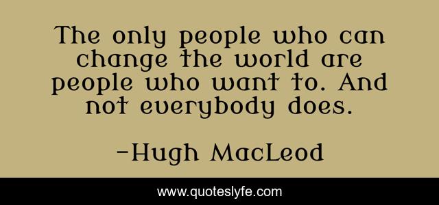 This page presents the quote "The only people who can change the world are people who want to. And not everybody does.". Author of this quote is Hugh MacLeod. This quote is about change-the-world, people, dreams, inspirational, enthusiasm,.