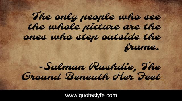This page presents the quote "The only people who see the whole picture are the ones who step outside the frame.". Author of this quote is Salman Rushdie, The Ground Beneath Her Feet. This quote is about perception, view-from-outside, outside-the-box, analysis, clear-view, whole-picture, clear-mindedness,.