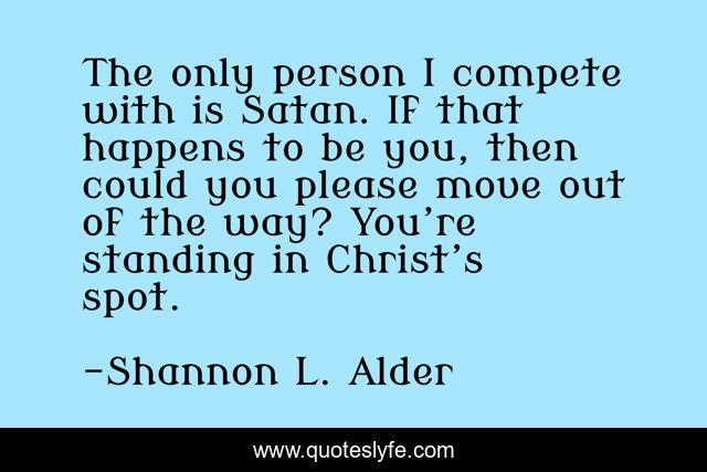 This page presents the quote "The only person I compete with is Satan. If that happens to be you, then could you please move out of the way? You’re standing in Christ’s spot.". Author of this quote is Shannon L. Alder. This quote is about funny, tests, humor, christ, trials, satan, bumper-sticker, comedy, adversity,.