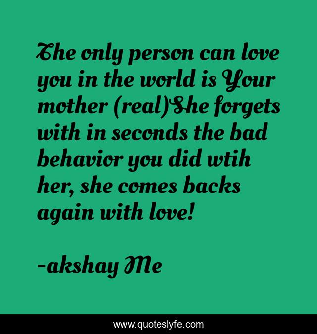 This page presents the quote "The only person can love you in the world is Your mother (real)She forgets with in seconds the bad behavior you did wtih her, she comes backs again with love!". Author of this quote is akshay Me. This quote is about gratitude, respect-your-mom, good, mother, world,.