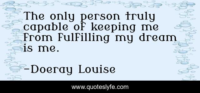 This page presents the quote "The only person truly capable of keeping me from fulfilling my dream is me.". Author of this quote is Doeray Louise. This quote is about spiritual, thriller,.
