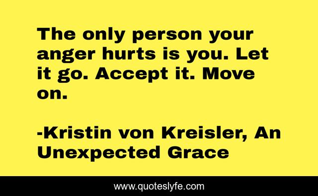This page presents the quote "The only person your anger hurts is you. Let it go. Accept it. Move on.". Author of this quote is Kristin von Kreisler, An Unexpected Grace. .
