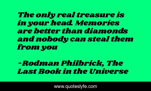 This page presents the quote "The only real treasure is in your head. Memories are better than diamonds and nobody can steal them from you". Author of this quote is Rodman Philbrick, The Last Book in the Universe. .