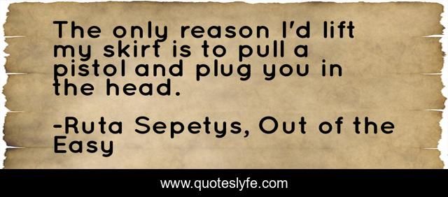 This page presents the quote "The only reason I'd lift my skirt is to pull a pistol and plug you in the head.". Author of this quote is Ruta Sepetys, Out of the Easy. This quote is about mystery-and-detective, new-orleans, murder, mothers-and-daughters, out-of-the-easy, prostitution, historical-fiction, 20th-century,.