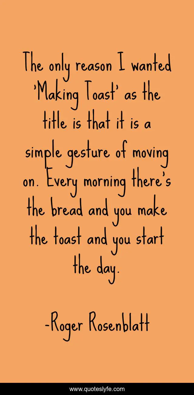 This page presents the quote "The only reason I wanted 'Making Toast' as the title is that it is a simple gesture of moving on. Every morning there's the bread and you make the toast and you start the day.". Author of this quote is Roger Rosenblatt. This quote is about simple, day, morning,.