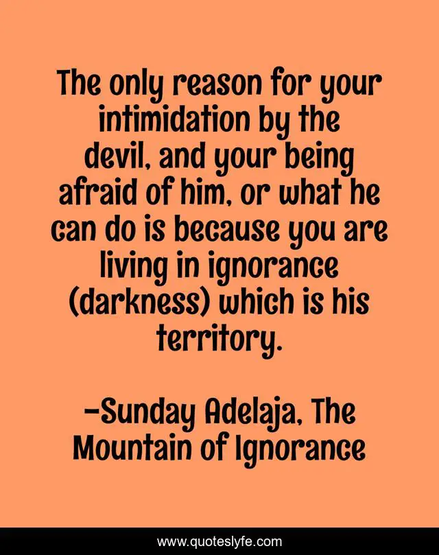 This page presents the quote "The only reason for your intimidation by the devil, and your being afraid of him, or what he can do is because you are living in ignorance (darkness) which is his territory.". Author of this quote is Sunday Adelaja, The Mountain of Ignorance. This quote is about living, devil-s-territory, devil, darkness, power, danger, god, people, life,.
