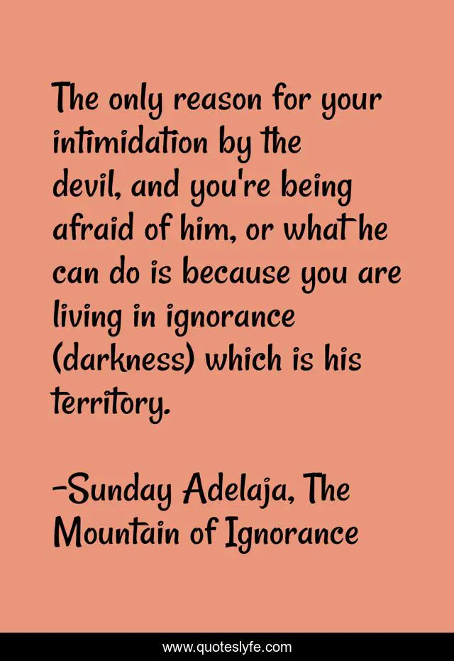 This page presents the quote "The only reason for your intimidation by the devil, and you're being afraid of him, or what he can do is because you are living in ignorance (darkness) which is his territory.". Author of this quote is Sunday Adelaja, The Mountain of Ignorance. This quote is about mountain, devil-s-territory, devil, darkness, power, danger, god, people, life,.