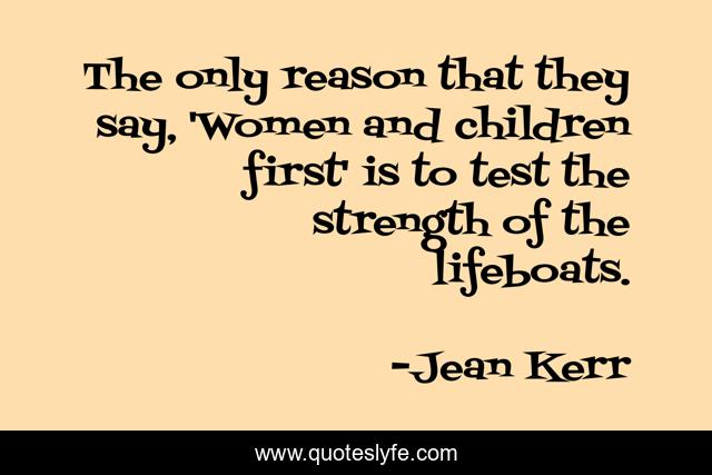 This page presents the quote "The only reason that they say, 'Women and children first' is to test the strength of the lifeboats.". Author of this quote is Jean Kerr. This quote is about lifeboats, women-s-rights, children,.