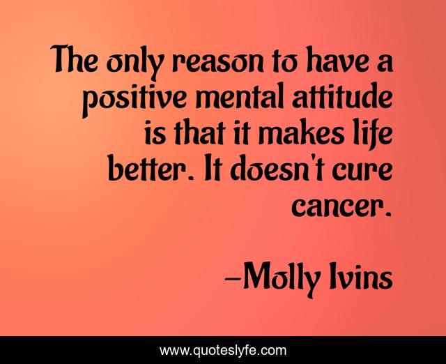 This page presents the quote "The only reason to have a positive mental attitude is that it makes life better. It doesn't cure cancer.". Author of this quote is Molly Ivins. This quote is about positive, life, confidence, cancer,.