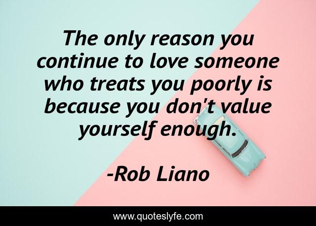 This page presents the quote "The only reason you continue to love someone who treats you poorly is because you don't value yourself enough.". Author of this quote is Rob Liano. This quote is about confidence, self-respect, joy, motivational, relationship-advice, self-worth, growth, optimistic, inspirational,.